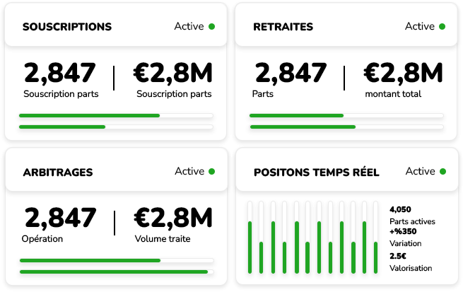 - Automatise l’enregistrement des mouvements de parts et génère les écritures de registre